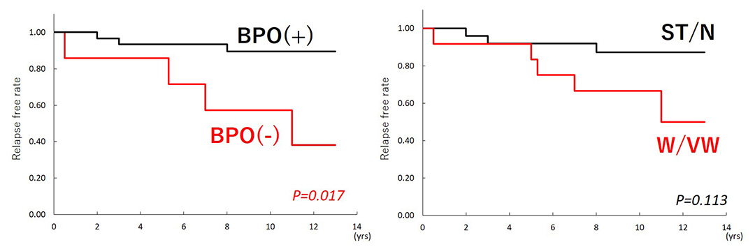 Figure 1: Relapse free rate; Kaplan-Meier estimates the relapse free rate between patients with and without BPO (left figure), and patients with ST/N detrusor contractility and with W/VW (right figure).