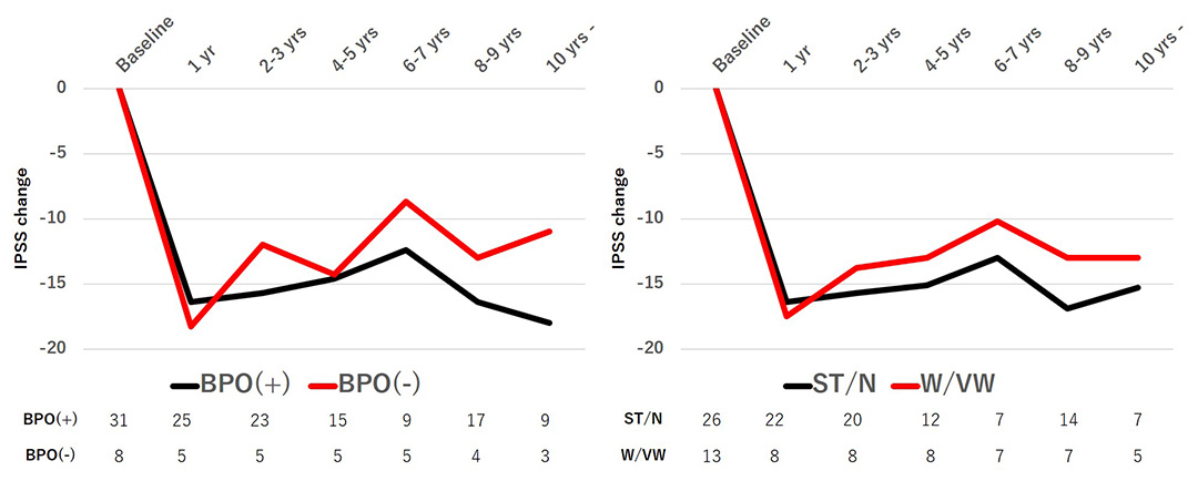 Figure 2: IPSS change after TURP; Comparison of IPSS change over time after TURP between patients with and without BPO (left figure), and patients with ST/N detrusor contractility and with W/VW (right figure).