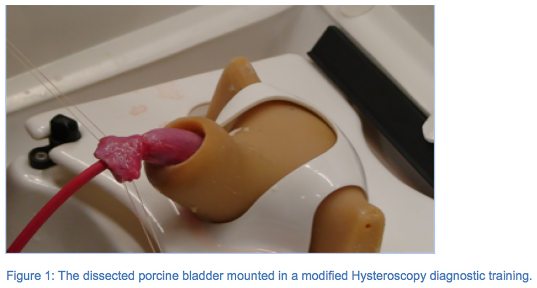 Dissected female porcine bladders were mounted in a modified Hysteroscopy Diagnostic Trainer (Figure 1). Using routine endoscopic equipment for this procedure with video monitoring, 6 urologists (experts group) and 6 urology trainee (novice group) completed urethral bulking agent (UBA) injections on a total of 12 bladders using ENI simulator. Face and content validities were assessed by using structured quantitative survey which rating the realism. Construct validity was assessed by comparing the performance of experts and novices the difference using Objective Structured Assessment of Technical Skills (OSATS). Trainees also completed a post-procedure feedback survey. Effective injections were evaluated by measuring the retrograde urethral opening pressure, visual cystoscopic coaptation, and post-procedure gross anatomic examination.