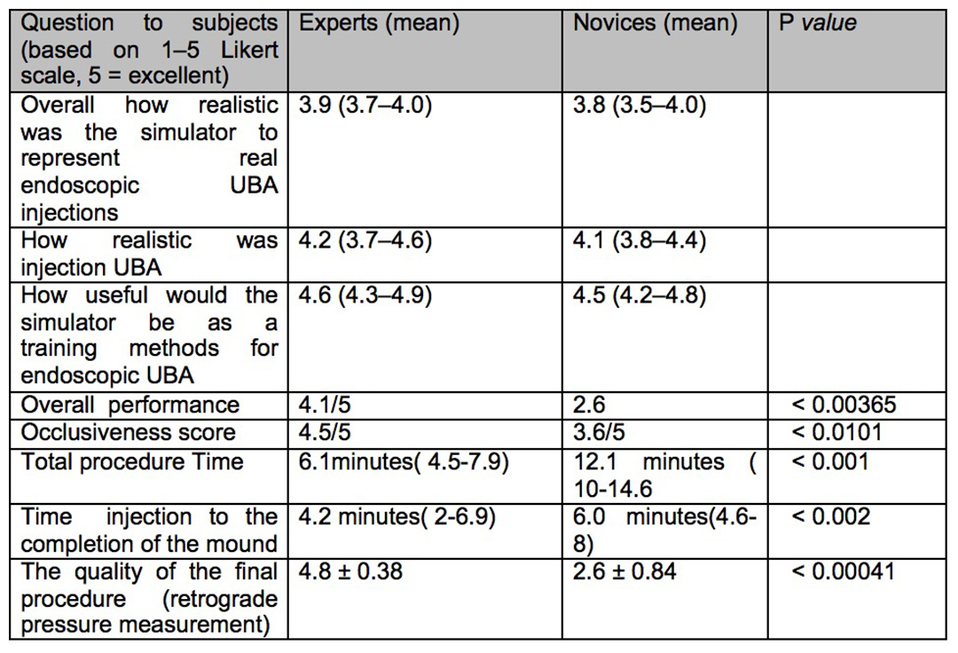 Experts significantly outperformed novices (P<001) across all measure of performance therefore establishing construct validity.