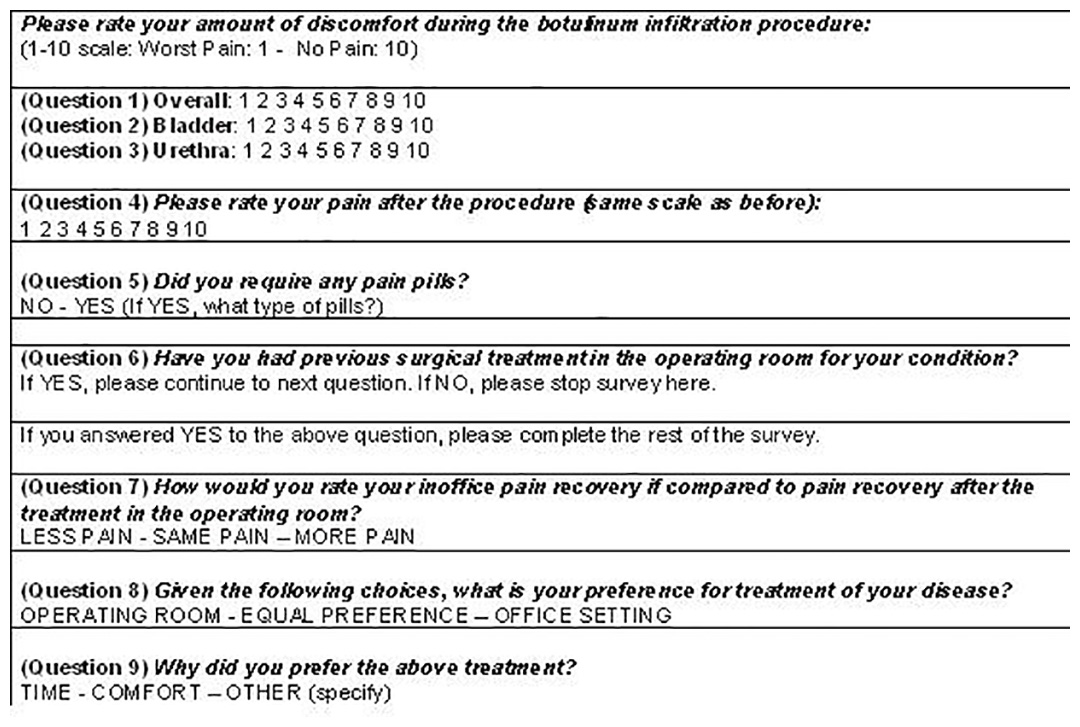 We enrolled all the patients who had undergone intravesical botulinum toxin injection in an office-based setting under local anesthesia (bladder instillation of lidocaine 2%, 10 mL + sodium bicharbonate 10mEq/10mL, 10 mL, diluited with sodium chloride 0.9%, 40 mL) from May–December 2017, regardless of whether they had previously undergone the same procedure in the operating room. No standardized questionnaire was available, so we modified the questionnaire used by Rees et al. for dye laser treatment to the upper aerodigestive tract (see Table 1). The questionnaire scores ranged from 1–10, with 1 representing “the worst pain” and 10 “no pain:”