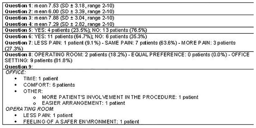 Eleven of the 17 patients had previously undergone the same procedure in the operating room. Overall, 9 of the 11 patients (81.8%) responded that they would prefer to repeat the procedure in an office-based setting rather than in the operating room. The results are summarized in Table 2.