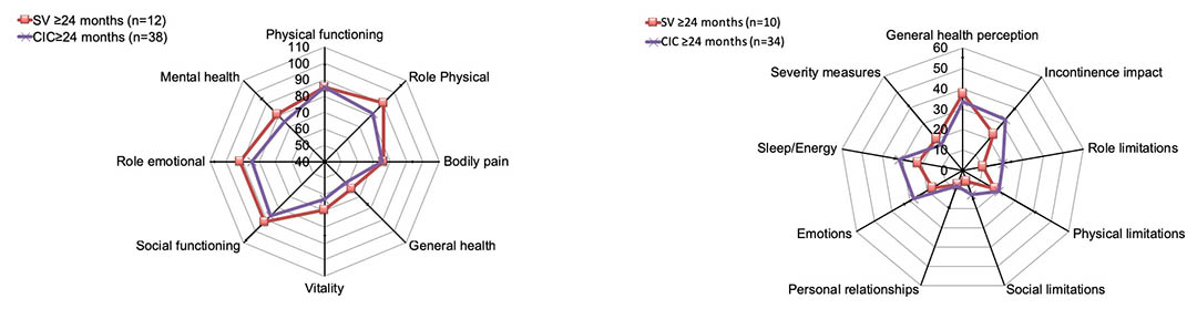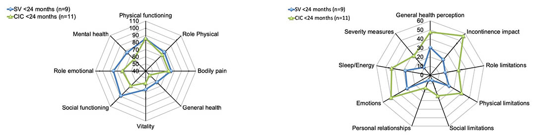 Figure 1 Figure1. SF-36 (left) and KHQ (right) in patients less than 24 months after radical hysterectomy. SV, spontaneous voiding; CIC, clean intermittent catheterization