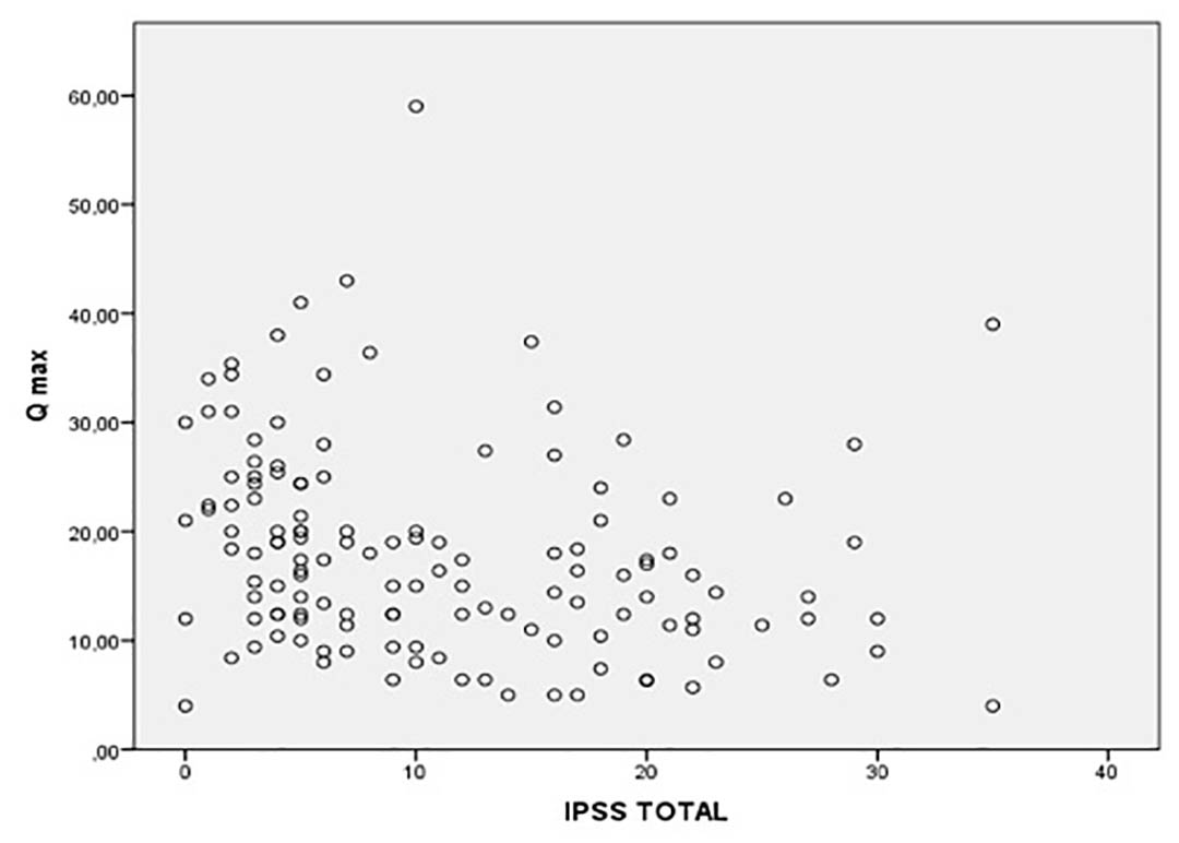 In this study, our results based on our sample, show that, although IPSS is a non specific questionnaire for LUTS evaluation, and male uroflowmetry value has a strong dependency on voided volume and age (1), the correlation is strong between those two methods in male with Qmax les than 10 ml/seg when compared with non specific male LUTS population.