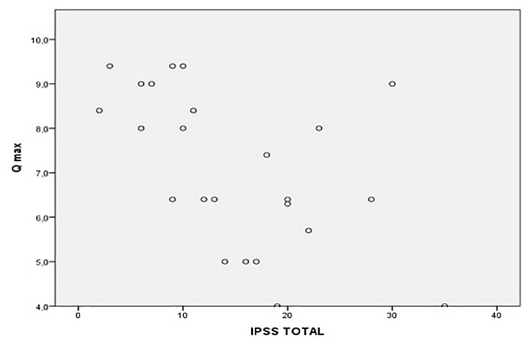 The mean age of study population was 56 years (range 33-79). Mean value of IPPS was 17,5 (range 0-35 ). Patients for a further sub analysis were divided by the IPSS into mild symptoms n=65 (47,8%), moderate 45 (33,6%) and severe 25(18,7%). The mean maximum flow rate was 18,04(range 4-59 ), mean medium flow rate was   11,3 (range 1,7-37,5), and average flow rate 8,66 (range 1,2-29,9).  The Pearson´s correlation between the data obtained in the whole population was not statistically significant; the bilateral correlation obtained for Qmax (figure 1) , Q medium and Q average  vs IPSS was Rho - ,241, -,361 and -,369 respectively. The same statistic results were obtained were each subgroup of IPSS severity were correlated with Uroflowmetry parameters. But in the sub analysis, confronting only the population with a Qmax less than 10ml/seg, the bilateral correlation obtained for Q max, Q medium and Q average  vs IPSS was Rho -,527 (figure 2), -563, and -,535, that could be consider statistically moderated to strong correlation, for this sample. The total value of IPSS has a strong correlation with the value of the quality of life of the same IPSS:  ,740 and ,587 in both IPSS vs Qmax for the whole sample and the IPSS vs the Qmax less than 10ml/seg subanalysis.
