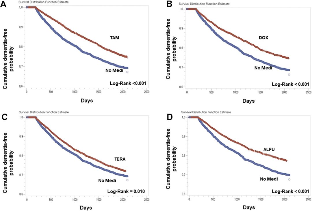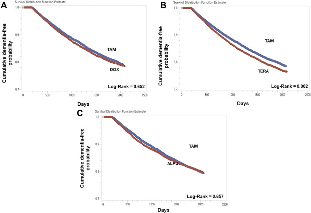 During a mean follow-up period of 1,580 (± 674.3) days, all inclusion and exclusion criteria were met by 59,472 patients with benign prostate hyperplasia. In the unadjusted cohort, the incidence of dementia in the tamsulosin, doxazosin, terazosin, alfuzosin, and no-medication cohorts were 17.96%, 18.55%, 20.64%, 17.62%, and 22.60%, respectively. After propensity score matching, the risk of dementia did not significantly differ between the tamsulosin cohort and the doxazosin [1.038 (0.960–1.121)] or alfuzosin [1.008 (0.925–1.098)] cohorts. The terazosin [1.112 (1.052–1.196)] cohort had a higher risk of dementia than the tamsulosin cohort. However, the risk of dementia was significantly lower in the terazosin cohort than in the no-medication cohort.