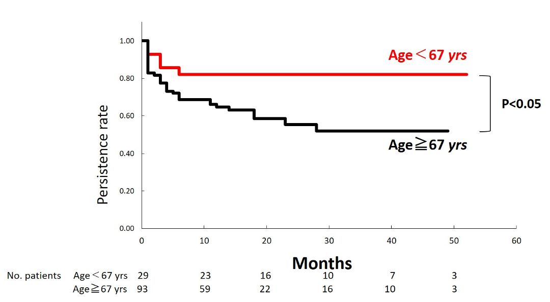 When excluding those patients who withdrew tadalafil due to AEs and symptom improvement, the persistence with tadalafil was significantly related only with age. Number of existing diseases or medicines for other diseases was not correlated with the persistence with tadalafil. A receiver operating characteristic (ROC) curve analysis confirmed 67 years old as the best cut-off age for the withdrawal (area under the curve=0.599). Kaplan-Meier method indicated the persistence rate at one year in patients < 67 years old and ≥ 67 years old were 82% and 65%, respectively (p<0.05, Figure). No influencing factors on the persistence rate were detected by the multivariate method.