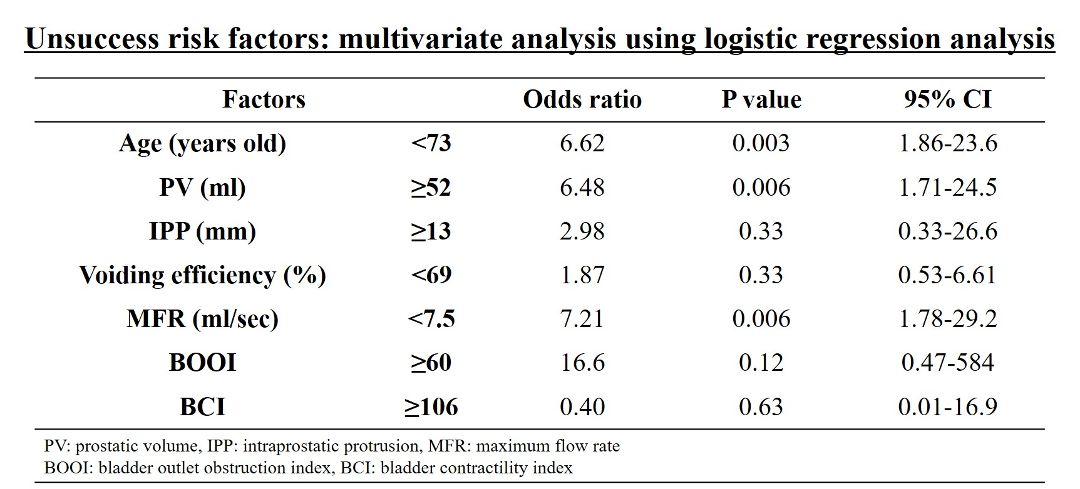 Of 92 patients, 23 (25%) were defined as treatment failure at 7 to 109 months (mean: 38 months) after dutasteride add-on treatment. In the failed group, the patients’ age was younger (71.6±6.8 vs 75.4±8.4, p=0.033), PV was larger (76±41 vs 49±26 ml, p=0.005), voiding efficiency was lower (54±27 vs 68±24%, p=0.045) and BOOI was higher (73±30 vs 48±30, p=0.015) before dutasteride add-on treatment. Using logistic regression analysis, age less than 73 years old (OR 6.62, 95%CI 1.86-23.6: p=0.003), PV ≧52 ml (OR 6.48, 95%CI 1.71-24.5: p=0.006), and MFR <7.5 ml/sec (OR 7.21, 95%CI 1.78-29.2: p=0.006) were associated with treatment failure (Table).